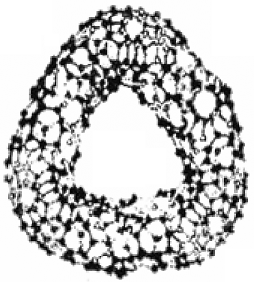 Многогранная структура частиц астралена составлена большими плоскими бездефектными графитовыми поверхностями, соединёнными краевыми дефектными областями преимущественно пятиугольной структуры. Поверхности составлены укладкой 20—50 плоских графеновых листов (расстояние между листами ~0,340 нм). Средний размер плоских поверхностей ~15 нм.[1]