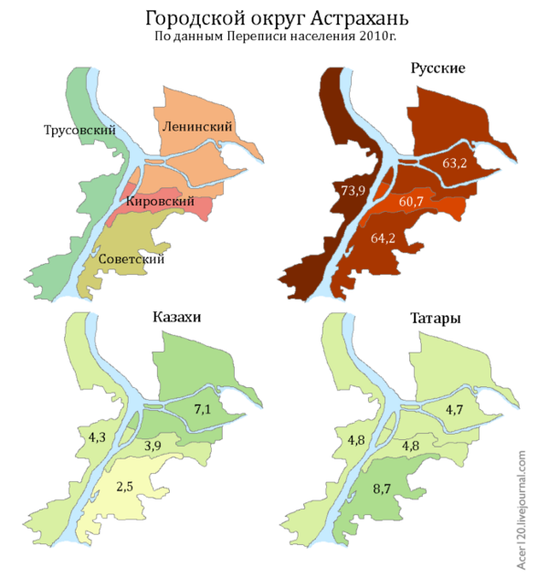 русские — 78,05 % казахи — 8,92 % татары — 4,61 % азербайджанцы — 0,97 % ногайцы — 0,84 % армяне — 0,65 % другие — 6,54 % [3] |