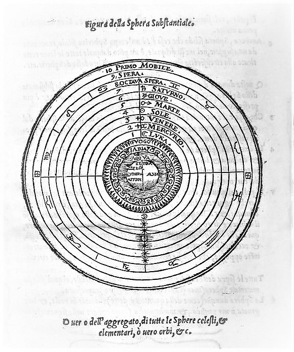 Аристотель полагал, что небесные тела переносятся в своём движении твёрдыми небесными сферами, к которым они прикреплены[41]. В трактате «О Небе» он утверждал, что небесные тела совершают равномерные круговые движения просто потому, что такова природа составляющего их эфира[42]. В трактате «Метафизика» он высказывает иное мнение: всё, что движется, приводится в движение чем-нибудь внешним, которое, в свою очередь, также чем-то движется, и так далее, пока мы не дойдём до двигателя, который сам по себе неподвижен. Таким образом, если небесные светила движутся посредством сфер, к которым они прикреплены, то эти сферы приводятся в движение двигателями, которые сами по себе неподвижны. За каждое небесное тело ответственно несколько «неподвижных двигателей», по числу сфер, которые его несут. Находящаяся на границе мира сфера неподвижных звёзд должна иметь только один двигатель, поскольку она совершает лишь одно движение — суточное вращение вокруг оси. Поскольку эта сфера охватывает весь мир, соответствующий двигатель (перводвигатель) и является в конечном итоге источником всех движений во Вселенной. Все неподвижные двигатели разделяют те же качества, что и перводвигатель: они являются нематериальными бестелесными образованиями и представляют собой чистый разум (латинские средневековые учёные называли их интеллигенциями и обычно отождествляли с ангелами)[43].