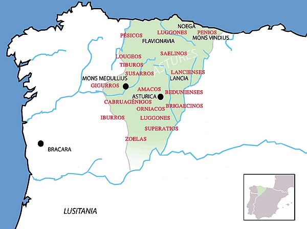 Плиний Старший, Помпоний Мела и Страбон говорят о двух основных группах, разделённых Кантабрическим хребтом: astures аugustanos (gigurri, lancienses и zoelas), или cismontanos со столицей в Астурике (Асторге, Леон), чьи владения простирались до реки Дуэро, и astures transmontanos (песики, луггоны), жившие между реками Селла и Навиа. Плиний Старший писал о 22 поселениях в Conventus Asturum с населением примерно 240 тыс. человек. Птолемей, в свою очередь говорил о 21 городе и 10 поселениях.