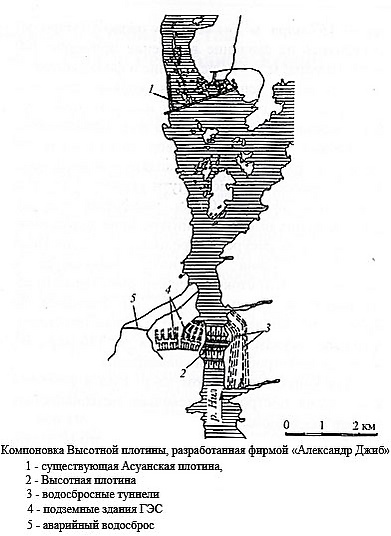 К 1952 году английской проектно-изыскательской фирмой «Александр Джиб» («Alexander Gibb»). был разработан проект Высотной Асуанской плотины. Была определена максимально возможная отметка верхнего бьефа водохранилища, предусматривающая возможность многолетнего регулирования стока Нила. Была определена ёмкость водохранилища — 157 млрд м куб. из которых около 30 млрд м куб. отводилось на заиление и 10 млрд м куб. — на испарение и фильтрацию. Этот проект предусматривал строительство водосбросных туннелей и транспортных туннелей общей протяжённостью 17 км. Водосбросные туннели должны были иметь диаметр 14,6 м и длину 2,1 км. Облицовку этих туннелей необходимо было выполнить железобетонной обделкой. Здание ГЭС должно было быть подземного типа с туннельным подводом и отводом воды.