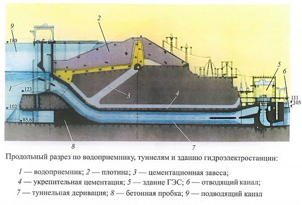 Советский проект гидроузла отличался от утверждённого коренным образом. Был сохранён район створа, но плотина была размещена на 400 метров выше, деривация была принята комбинированной. Основную её часть составляют подводящий и отводящий каналы, и только участок в 315 метров выполнен в виде шести туннелей диаметром по 15 метров. Для создания деривации была выполнена открытая скальная выемка глубиной до 70 метров и объёмом около 10 млн м. куб. Камень из этой выемки использовали для отсыпки в плотину и для планировки строительной площадки. Туннели длиной по 315 метров в строительный период после перекрытия русла отводили воду на недостроенное здание ГЭС, а во время эксплуатации вода по ним подаётся к турбинам и водосбросам, также размещённым в здании ГЭС.