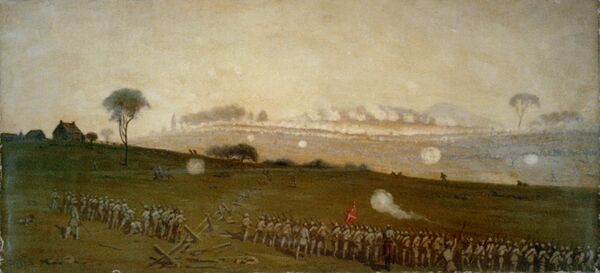 Батареи Юга приостановили огонь, позволив пехоте пройти через свою позицию. Только теперь пехотинцы увидели высоту, которую им предстояло штурмовать. Артиллеристы запомнили, как рядовые переговаривались между собой, говоря, что «это будет похуже, чем Малверн-Хилл». Как только они оказались в зоне огня федеральной артиллерии, по ним открыли огонь 39 орудий майора Осборна с Кладбищенского холма. «В бинокль мы видели, как бреши возникают в их линиях, — вспоминал генерал Карл Шурц, — и как земля покрывается темными пятнами — убитыми и ранеными… Но храбрые мятежники быстро смыкали ряды и продолжали свой марш неколебимо и уверенно». Стиверн Сирс предположил, что Шурц наблюдал наступление бригады Маршалла или Фрая, поскольку бригада Брокенбро шла весьма неорганизованно[67].