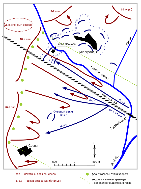 Для новой генеральной атаки была выделена 11-я дивизия ландвера. На основном направлении вдоль шоссе и железной дороги был развёрнут усиленный маршевыми частями[i 4] 18-й полк. Южнее должен был атаковать 76-й полк. Для успеха операции по фронту обоих полков было решено применить массированную газобаллонную атаку хлором в смеси с бромом. Прочие части дивизии к северу и северо-востоку должны были поддержать атаку демонстративными действиями.