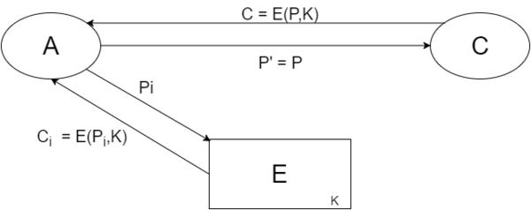 На рис.1 приведена схема атаки на основе подобранного открытого текста. Атакующий (A) получает шифротекст от пользователя (С). Задача атакующего — «угадать» открытый текст . Так как атакующий имеет доступ к блоку шифрования , он имеет возможность зашифровывать свои сообщения и анализировать полученные шифротексты. . В итоге, атакующий подбирает сообщение и пересылает его пользователю.