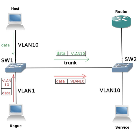 Рассмотрим топологию, изображённую на рисунке. Пусть native VLAN имеет номер 1 (по умолчанию). Router выполняет роль Router on a stick для всей сети, в том числе числе разграничивает доступ одних VLAN к другим. Пусть VLAN10 может пересылать информацию в любую другую VLAN, но обратный поток запрещён. Пусть Host — легитимный пользователь, а Rogue — злоумышленник. Пусть атакующий отсылает кадр, маркированный как принадлежащий VLAN10. Коммутатор SW1, получив фрейм с порта, принадлежащего native VLAN, не маркирует его, а пересылает дальше через trunk. Однако коммутатор SW2 на другом конце, получив кадр, замечает, что он маркирован, выясняет, какой VLAN он принадлежит, убирает маркировку и пересылает кадр далее во VLAN10. Как видно на рисунке, кадры злоумышленника выглядят так же, как и кадры легитимного пользователя для SW2. Таким образом, атакующий смог обойти ограничения, обеспечиваемые маршрутизатором Router, и переслать информацию напрямую между разными VLAN.