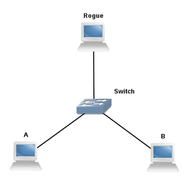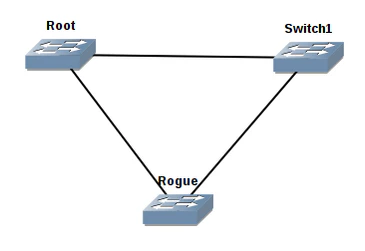 Пусть изначально в сети было два коммутатора: Root, корневой, и Switch1. Затем злоумышленник подключил контролируемый им коммутатор Rogue, настроенный так, чтобы стать корневым узлом дерева STP.