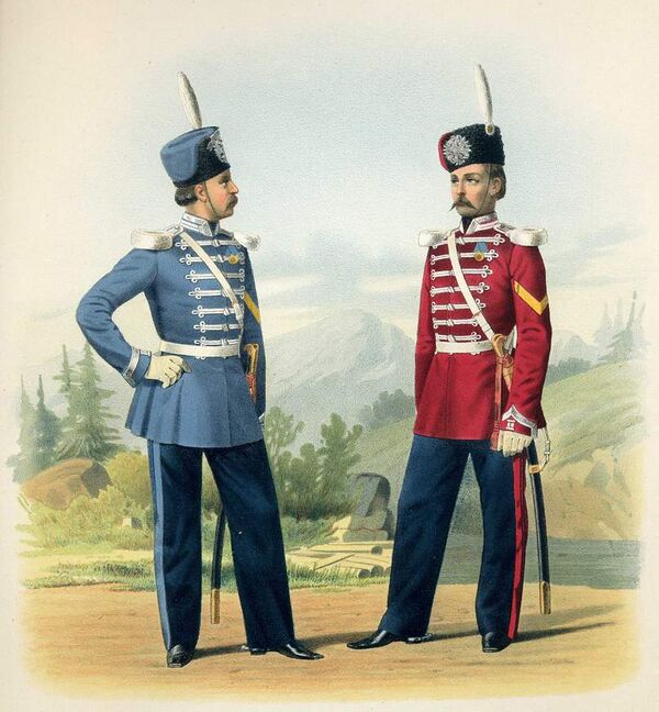Мундир (парадный), погоны, шлык, тулья — светло-голубые, мундир (повседневный), чекмень, околыш, выпушка тульи — тёмно-синие, эполеты, металлический прибор — серебряный.