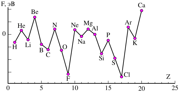 На рисунке представлена зависимость энергии сродства к электрону атомов от порядкового номера элемента. Наибольшим сродством к электрону обладают атомы галогенов (3—4 эВ).