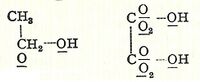 Молекулярные структуры Арчибальда Купера для спирта и щавелевой кислоты, использующие элементарные символы для атомов и линии для связей (1858).