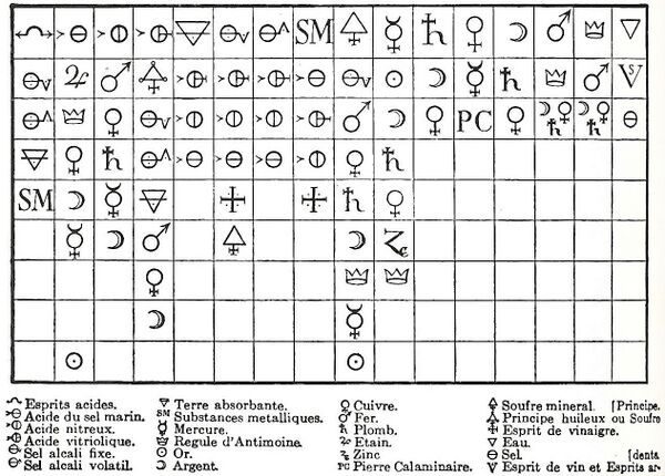 Ранним предшественником идеи связанных «комбинаций атомов» была теория «объединения через химическое сродство». Например, в 1718 году, основываясь на концепции Бойля о комбинациях кластеров, французский химик Этьен Франсуа Жоффруа разработал теорию химического сродства для объяснения комбинаций частиц, полагая, что определенная алхимическая «сила» притягивает определенные алхимические компоненты. Имя Жоффруа наиболее известно в связи с его таблицами «сродства» (tables des rapports), которые он представил Французской академии в 1718-1720 годах. Это были списки, составленные путем сопоставления наблюдений за действием веществ друг на друга, показывающие различные степени сродства, проявляемые аналогичными телами для различных реагентов. Эти таблицы сохраняли свою актуальность до конца столетия, пока не были вытеснены более глубокими концепциями, введенными Клодом Бертолле.