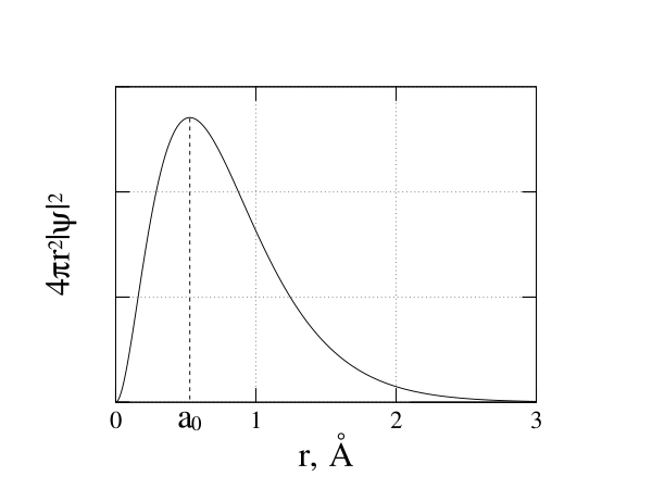 Радиальная зависимость dp(r)/dr плотности вероятности нахождения электрона в атоме водорода, находящемся в основном состоянии, представлена на рисунке. Эта зависимость даёт вероятность того, что электрон будет обнаружен в тонком шаровом слое радиуса r толщиной dr с центром в ядре. Площадь этого слоя равна S = 4πr2, его объём dV = 4πr2dr. Общая вероятность нахождения электрона в слое равна (4πr2dr) ψ2, поскольку в основном состоянии волновая функция электрона сферически симметрична (то есть постоянна в рассматриваемом шаровом слое). Рисунок выражает зависимость dp(r)/dr = 4πr2ψ2. Кривая радиального распределения плотности вероятности dp(r)/dr нахождения электрона в атоме водорода имеет максимум при a0. Этот наиболее вероятный радиус совпадает с боровским радиусом. Размытое облако плотности вероятности, полученное при квантовомеханическом рассмотрении, значительно отличается от результатов теории Бора и согласуется с принципом неопределённости Гейзенберга. Это размытое сферически симметричное распределение плотности вероятности нахождения электрона, называемое электронной оболочкой, экранирует ядро и делает физическую систему протон-электрон электронейтральной и сферически симметричной — у атома водорода в основном состоянии отсутствуют электрический и магнитный дипольные моменты (как и моменты более высоких порядков), если пренебречь спинами электрона и ядра. Максимум объёмной плотности вероятности ψ2 достигается не при r = a0, как для радиальной зависимости, а при r = 0.
