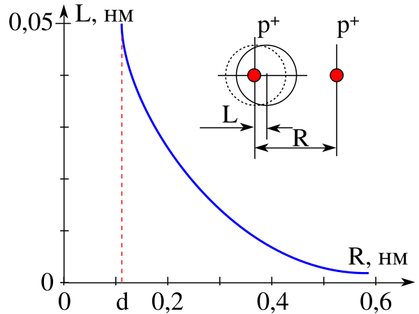 Нейтральный атом водорода, попадая в электрическое поле протона, подвергается деформационной поляризации (см. рисунок). Длина наведённого электрического диполя атома водорода обратно пропорциональна квадрату расстояния между атомом водорода и протоном L = αe E/q = αe/R2 = 0,66/R2