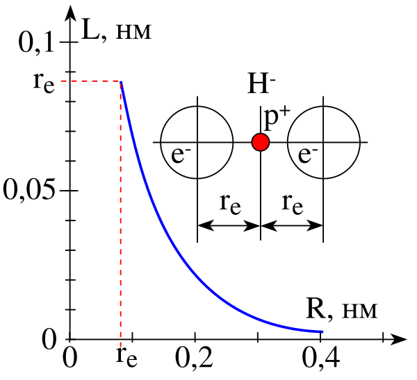 Сближение атома водорода и электрона возможно до тех пор, пока центры областей плотностей вероятности нахождения обоих электронов не станут равноудалёнными от ядра объединённой системы — отрицательно заряженного иона водорода. Такое состояние системы имеет место при