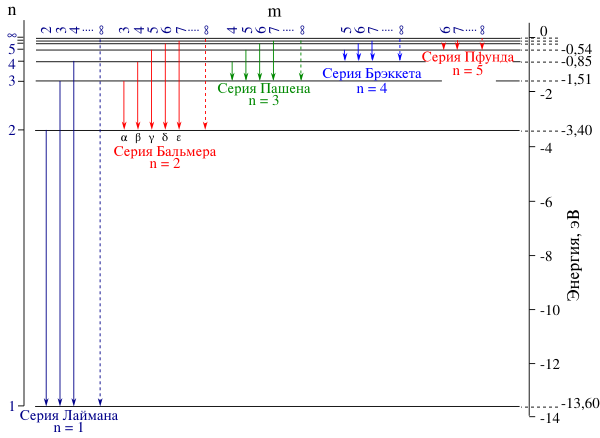 Схема образования спектра атомарного водорода и спектральные серии представлена на рисунке[3].