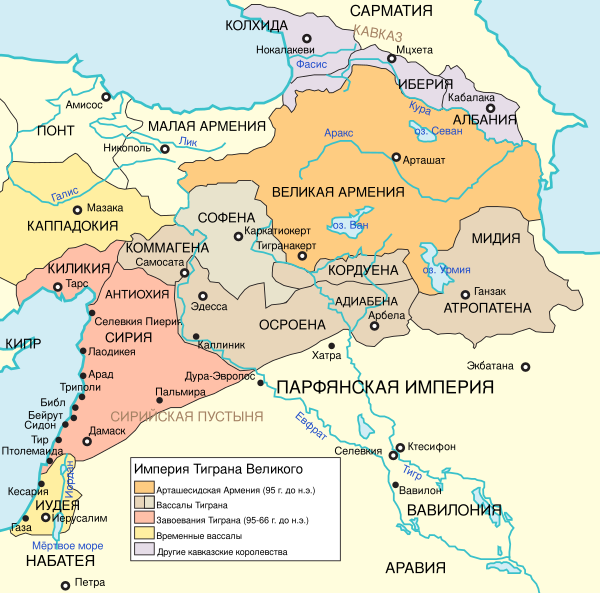 Закавказье в II—I веках до н. э. Заштрихованы земли, отошедшие к Великой Армении во II веке до н. э.[1] |
