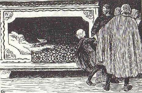 После того как он принес в жертву седьмого сына, он прожил еще десять лет, но уже не мог ходить. Его носили на престоле. Он принес в жертву восьмого сына и прожил еще десять лет, лежа в постели. Он принес в жертву девятого сына и прожил еще десять лет, и сосал рожок, как младенец. У Ауна оставался тогда еще один сын, и он хотел принести его в жертву... Но шведы не позволили ему совершить жертвоприношение. Тут Аун конунг умер, и в Уппсале ему насыпали курган.