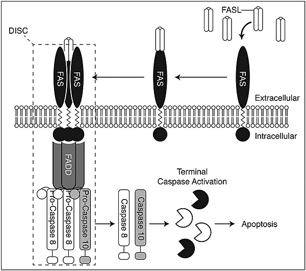 В основе развития АЛПС лежит нарушение механизма апоптоза лимфоцитов, в первую очередь затрагивающее ключевой FAS-опосредованный путь. В норме активация FAS-рецептора на поверхности лимфоцита его лигандом (FASL) запускает внутриклеточный каскад реакций. Этот сигнал передаётся через внутриклеточный «домен смерти» на адапторный белок FADD, который, в свою очередь, активирует каспазы-8 и -10 (инициаторные каспазы). Активированные каспазы запускают протеолитический каскад, приводящий к необратимому апоптозу клетки, что является основным механизмом контроля за числом прошедших активацию лимфоцитов и поддержания иммунологической толерантности. Мутации в любом из генов, кодирующих белки этого пути, нарушают передачу сигнала, блокируя апоптоз. Это приводит к двум ключевым последствиям: неконтролируемому накоплению активированных лимфоцитов и экспансии особой популяции — так называемых двойных негативных Т-клеток (DNT-клеток), имеющих фенотип TCRα/β+CD3+CD4-CD8-[4].