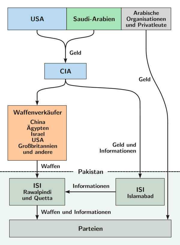 Под наблюдением ЦРУ поставлялось оружие для антиправительственных вооружённых формирований. На территории Пакистана в лагерях афганских беженцев были развёрнуты центры специальной подготовки вооружённых группировок. Главным образом программа основывалась на использовании пакистанской межведомственной разведки в качестве посредника для распределения финансирования, снабжения оружием и обучения афганских сил сопротивления[53].