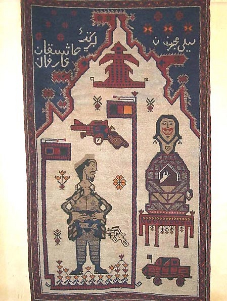 Победные ковры также содержат изображения вооружения, но в этом случае — принадлежащего моджахедам, противостоящим вторжению. Другим распространённым рисунком на победных коврах являются карты вывода советских войск[3].