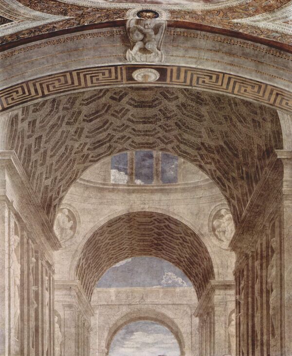 И. А. Смирнова подчеркнула ещё одну важную особенность: «Афинская школа» как бы замыкает пространственную композицию зала. «Движение в этой фреске развивается из глубины к первому плану». Прекрасный храм, открывающийся за спинами беседующих философов, «лишён пространственной активности». Фигуры выходят из арки и по ступеням спускаются к зрителям. Философы на первом плане кажутся расположенными рядом с нами. В «Диспуте», фреске напротив «Афинской школы», пространство величественно и плавно уходит по ступеням алтаря в глубину и вверх. Таким образом возникает ось движения от «Афинской школы» (мира земного) к «Диспуте» (миру небесному)[9].