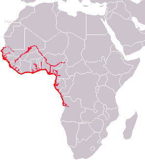Ламантины были обнаружены на расстоянии до 75 км от берега, где имеются мелководные прибрежные отмели и спокойные мангровые протоки, заполненные морской травой. Внутренние озёра, где обитают ламантины, включают озеро Вольта, внутреннюю дельту реки Нигер в Мали, озеро Лере и озеро де Трене. Из-за колебаний расхода воды и уровня в реках некоторые из этих постоянных озёр служат убежищем для ламантинов в соединяющихся реках в сухой сезон. С севера на юг речные системы, в которых встречаются ламантины, включают: Сенегал, Салум, Гамбия, Касаманса, Кашеу, Мансоа, Геба, Буба, Томбали, Касине, Когон, Конкуре, Сьерра-Леоне, Грейт-Скарсис, Литл-Скарсис, Шербро, Малем, Ваанже, Сева, Миссунадо, Кавалла, Сент-Пол, Морро, Сент-Джон, Бандама, Ниуниуру, Сассандра, Комоэ, Биа, Тано, Вольта, Моно, Уэме, Нигер, Мекру, Бенуэ, Кросс, Кацена-Ала, Бани, Аквайафе, Рио-дель-Рей, Нгоссо, Андокат, Мене, Мунаия, Вури, Санага, Фаро, Шари, Бамаингуи, Бар-Киета, Логоне, Митемеле, Габон, Огове, Лованзи, Куилу-Ниари, Конго, Дандэ, Бенго и Куанза. Ламантины поднимаются вверх по этим рекам до тех пор, пока не сталкиваются с мелководьем или сильными водопадами.