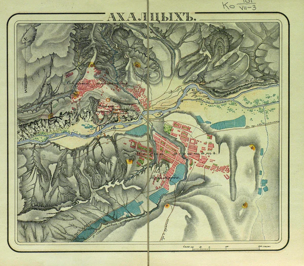 Собственно Ахалцихская крепость состояла из двух отделений: крутая голая скала, обнесенная каменной стеной, составляла цитадель, а несколько ниже примыкала к ней так называемая Верхняя крепость, построенная на высоком береговом утесе и обнесенная двойным рядом стен, фланкированных башнями. Сорок орудий обороняли эти стены, слежавшиеся веками в такую плотную массу, против которой бессильно было действие полевой артиллерии. В крепости помещались все казенные здания, дом паши и главная ахалцихская мечеть, при которой имелась одна из богатейших библиотек мусульманского Востока.[7] .
