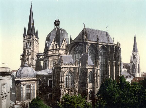 На конец XIX века из 27 церквей, находящихся в городе, наиболее примечателен Ахенский собор, в 1978 году внесен в список Всемирного наследия ЮНЕСКО[8]. Ядром его служит императорская капелла (Pfalzkapelle), построенная около 796 года по инициативе Карла Великого Одоном Мецским в византийском стиле и освящённая в 804 году папой Львом III[6]. Капелла упоминается во французском названии Ахена — Aix-la-Chapelle (Экс-ля-Шапель), где Aix происходит от лат. aqua / древнегерм. ahha — «вода», и фр. chapelle — «капелла». В монастыре Аахенского собора находится знаменитая Сокровищница.