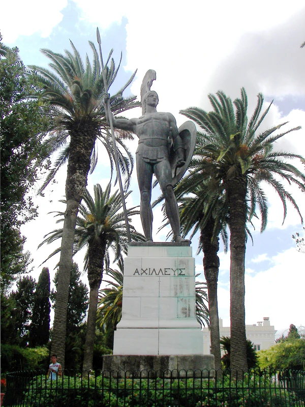 По другим данным, надпись на древнегреческом означала: «Эта статуя Ахилла, сына Пелея, воздвигнута Вильгельмом, великим немцем, на память тем, кто придёт после»[14]. После Второй мировой войны надпись удалили, на постаменте осталось только имя: «ΑΧΙΛΛΕΥΣ»[15]. Статуя, заказанная кайзером, представляет собой Ахилла, одетого в полные гоплитские доспехи. На его щите изображена голова Медузы Горгоны, обращающей в камень своим взглядом, а колени защищают львиные головы. Статую окружают пальмы, подчёркивающие её изящные очертания[1].
