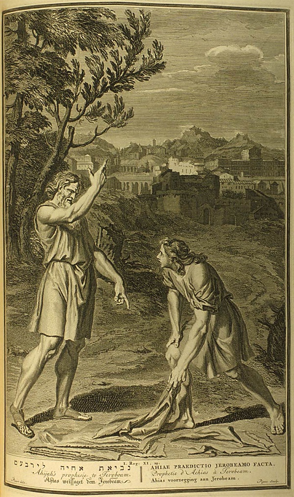И взял Ахия новую одежду, которая была на нем, и разодрал её на двенадцать частей, и сказал Иеровоаму: возьми себе десять частей, ибо так говорит Господь Бог Израилев: вот, Я исторгаю царство из руки Соломоновой и даю тебе десять колен, а одно колено останется за ним ради раба Моего Давида и ради города Иерусалима, который Я избрал из всех колен Израилевых.