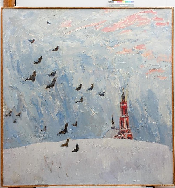На переднем плане картины изображено заснеженное поле, занимающее значительную часть композиции. На заднем плане справа виднеются купол и верхняя часть красной колокольни, что добавляет в пейзаж элементы архитектуры. В левой части полотна на фоне снега и синего неба изображены птицы, придающие сцене динамику. В правой верхней части неба заметны розовые блики, что подчёркивает особенности цветовой гаммы и создаёт ощущение вечернего или утреннего освещения.