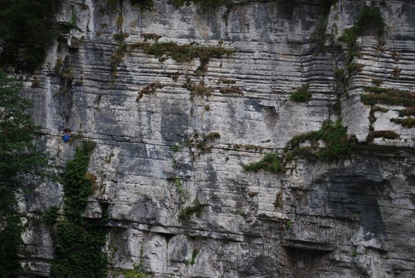 Поднятие известнякового пласта началось около 20 млн лет назад и продолжается сегодня. Но, вздымаясь, хребет Ахцу начал преграждать путь горной реке Мзымте. По мере поднятия хребта река прорезала в нем сквозное ущелье. На 34 километре пути находится самое узкое место ущелья. Громадная серая скала, отделённая от основного массива трещиной, нависла над клокочущей рекой, грозя запереть её своей тяжестью. В этом месте 13 января 1968 г. произошёл обвал, перекрывший реку, и возникло озеро глубиной до 18 м. Через 5—7 лет река размыла образовавшуюся запруду, и озеро исчезло[1].