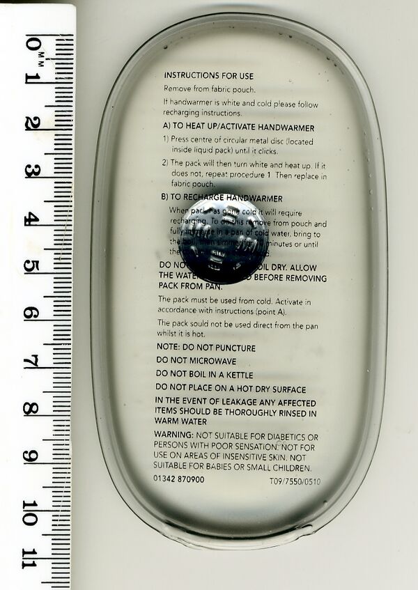 Ацетат натрия также используется в быту как составная химических грелок (англ. heating pad) или химических обогревателей (англ. Hand warmer), применяется как составная часть смеси «горячего льда» (англ. «hot ice»), при кристаллизации ацетата натрия выделяется тепло — это экзотермический процесс. При нагреве тригидрата ацетата натрия (имеющего точку плавления в 58 °C) до 100 °C (обычно ёмкость с ним кладут в кипящую воду) он расплавляется (вернее, растворяется в собственной кристаллизационной воде) и переходит в водный раствор ацетата натрия. При охлаждении этого раствора образуется перенасыщенный раствор ацетата натрия в воде. Этот раствор прекрасно переохлаждается до комнатной температуры без образования твёрдой фазы, затем нажатием на металлический диск в ёмкости образуется центр кристаллизации, который, вырастая, заставляет перенасыщенный раствор переходить в твёрдую фазу тригидрата ацетата натрия. Этот процесс сопровождается значительным выделением тепла (экзотермическая реакция)[2][3][4], теплота фазового перехода составляет 264-289 кДж/кг[5].