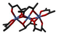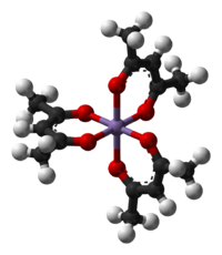 Ацетилацетонат анион образует комплексы с многими ионами переходных металлов, где оба атома кислорода связаны с металлом, образуя шестичленные хелатные комплексы. Некоторые примеры, включая Mn(acac)3[5], VO(acac)2, Fe(acac)3, и Co(acac)3. Любой комплекс формулы M(acac)3 хиральный (имеет несовместимость со своим отражением в зеркале). Дополнительно комплексы M(acac)3 могут быть восстановлены электрохимически; глубина восстановления зависит от растворителя и металлического центра[6]. Бис и трис комплексы типа M(acac)2 и M(acac)3 в основном растворимы в органических растворителях, в противоположность соответствующим галидам. Важное применение включает в себя использование их в 1Н ЯМР в качестве «смещающего реагента» и в качестве катализаторов в органическом синтезе, и прекурсоров к промышленным катализаторам гидроформилирования. C5H7O2− соединения в некоторых случаях происходит через центральный углеродный атом; этот тип связывания более характерен для переходных металлов третьего ряда таких как платина(II) и иридий(III).