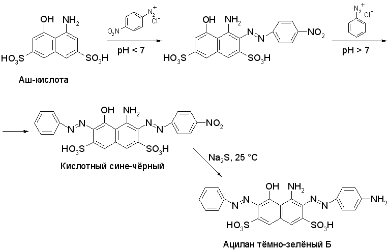 На втором этапе в кислотном сине-чёрном восстанавливают нитрогруппу с помощью сульфида натрия при 25 °C, получая ацилан тёмно-зелёный Б[2].