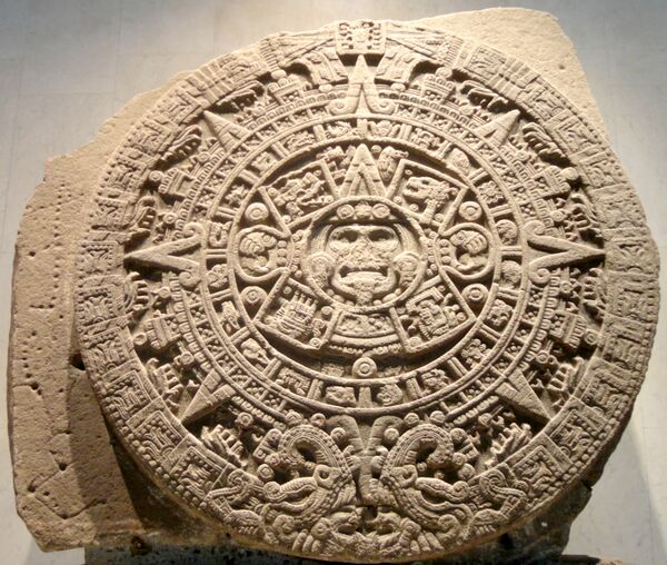 Информация о сотворении мира согласно мифологии ацтеков известна из ряда письменных источников, составленных индейцами после начала испанского колониального периода. Самый известный из них миф о сотворении мира, описывает четыре великие эпохи, каждая из которых управлялась одним из божеств в ацтекском пантеоне, а мир был населён разными существами. Каждая из эпох закончилась вселенской катастрофой. Наша эра — Науи-Оллин, пятая эпоха, пятое солнце или пятое сотворение, — избежала разрушения благодаря самопожертвованию бога Нанауатля, что значит «весь в ранах» (по-русски обычно переводится «весь в бубонах»; самый малый и смиренный бог, страдавший от болей, вызванных тяжкой болезнью; он превратился в Солнце). Этот миф связан с древним городом Теотиуаканом (букв. «место превращения в бога»), который уже был покинут и заброшен в те времена, когда в долину современного Мехико пришли ацтеки[49].