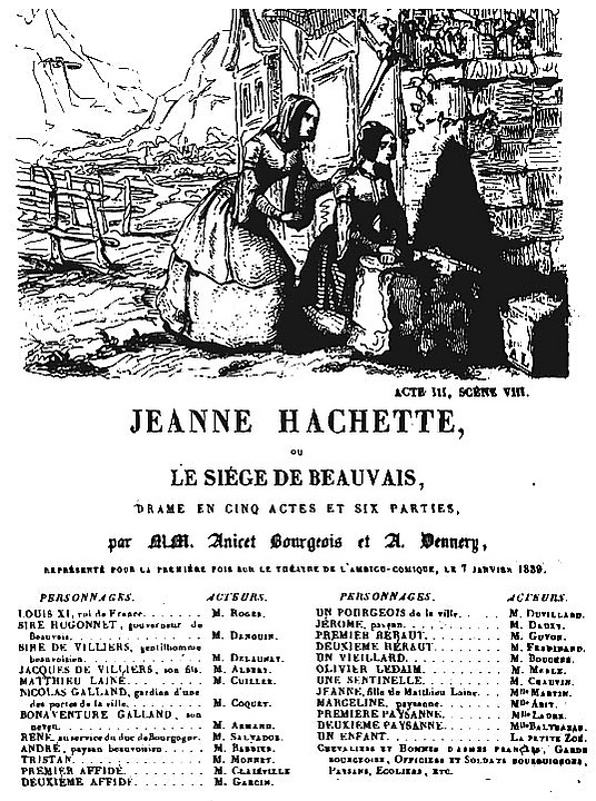 - 1838 — драма в пяти действиях и шести частях «Жанна Ашетт или осада Бове» Адольфа д’Эннери и Огюста Анисе-Буржуа.