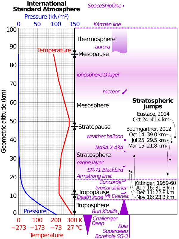Воздух — смесь газов, состоит из молекул ряда химических элементов, среди которых — азот (78 %), Кислород (21 %) и остальные: аргон, углекислый газ, водород и другие. Физические свойства воздуха и его состав существенно изменяются с увеличением расстояния от земли. Это обстоятельство особенно важно при решении проблем аэродинамики в авиации и ракетной технике. Важность учёта изменений свойств воздуха с высотой обусловило введение международного стандарта. На рисунке показаны основные свойства такой стандартной атмосферы.