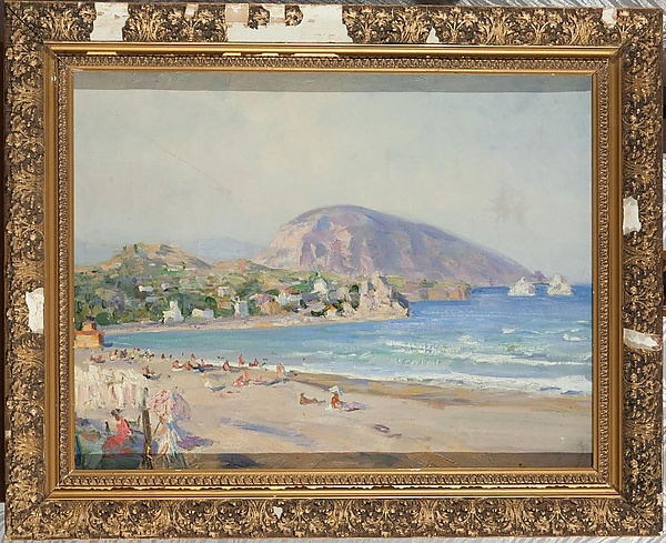 На переднем плане композиции изображены люди, отдыхающие под тентом, а рядом — дама в светлом платье с розовым зонтом. На втором плане вдоль берега располагаются загорающие и купающиеся на пляже люди. Справа в море вдается гористый берег с домами, окружёнными зеленью, и скалой на конце. Вдали виднеется гора Медведь и две скалы перед ней. Море передано насыщенными синими оттенками с белыми пенистыми "барашками", небо — голубое с лёгкими облаками. Сцена выполнена в традициях жанра марины, сочетая элементы жанрового и пейзажного изображения.
