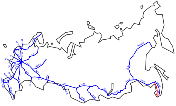 - 0 км — Хабаровск (0 км считается от пересечения с улицей Оборонной, выезд из города — 14 км)