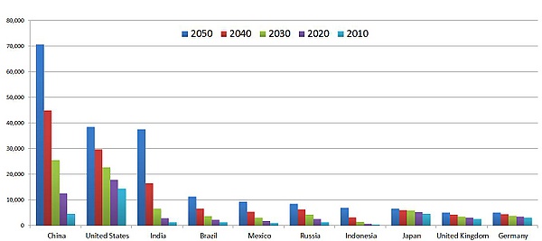 Эксперты утверждают, что экономический потенциал Бразилии, России, Индии и Китая таков, что они могут стать четырьмя доминирующими экономическими системами к 2050 году. Тезис был предложен экспертом Джимом О’Нилом в 2001 году. Эти страны занимают более чем 25 % суши в мире, 40 % населения и имеют объединённый валовой внутренний продукт (ВВП) 15,435 трлн долларов. Почти в каждом сравнении они будут наибольшим глобальным объектом. Эти четыре страны — среди самых больших и наиболее быстро растущих формирующихся рынков.