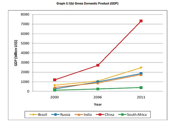 Пять стран БРИКС стали значимы в мировом масштабе во многих экономических, социальных, политических и военных областях. Например, Китай является первой по величине экономикой в мире и вместе с Индией входит в десятку стран по темпам роста ВВП. В большинстве других категорий страны БРИКС занимают высокие позиции.