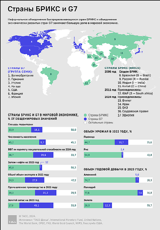 По итогам 2023 года доля стран БРИКС в мировом ВВП по паритету покупательной способности выросла до 35 %, превысив удельный вес G7[13].
