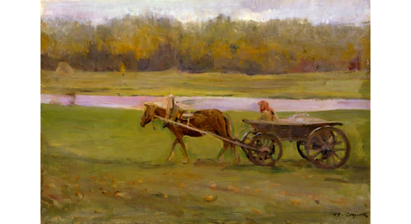 Вдоль берега реки на телеге, запряжённой лошадью, едет крестьянка. Она сосредоточенно смотрит вперёд, голова её закутана платком, и зритель не видит, молодая она или старая, привлекательная или нет. Полусогнутая фигура женщины наводит на мысли об усталости. Лошадь бредёт, неспешно переставляя ноги. Колёса телеги как будто подпрыгивают на кочках. В передаче этого неторопливого, словно затруднённого движения выражено всё мастерство художника[5].