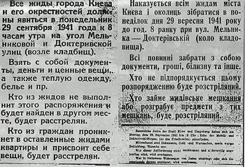 В конце сентября 1941 года зондеркоманда захватила девять ведущих раввинов Киева и приказала им сделать воззвание: «После санобработки все евреи и их дети, как элитная нация, будут переправлены в безопасные места…»[11]. 27—28 сентября нацистские власти отдали приказ о том, чтобы 29 сентября еврейское население города к 8 часам утра явилось в назначенную точку сбора с документами и ценными вещами. За невыполнение приказа грозили расстрелом. По городу было расклеено около 2 тыс. объявлений. Одновременно через украинских дворников и управдомов распространялась дезинформация о намерении провести перепись и переселение евреев. Большинство из пришедших составляли женщины, дети и старики, поскольку взрослое мужское население было призвано в армию, кроме евреев были представители других национальностей из интернациональных семей.