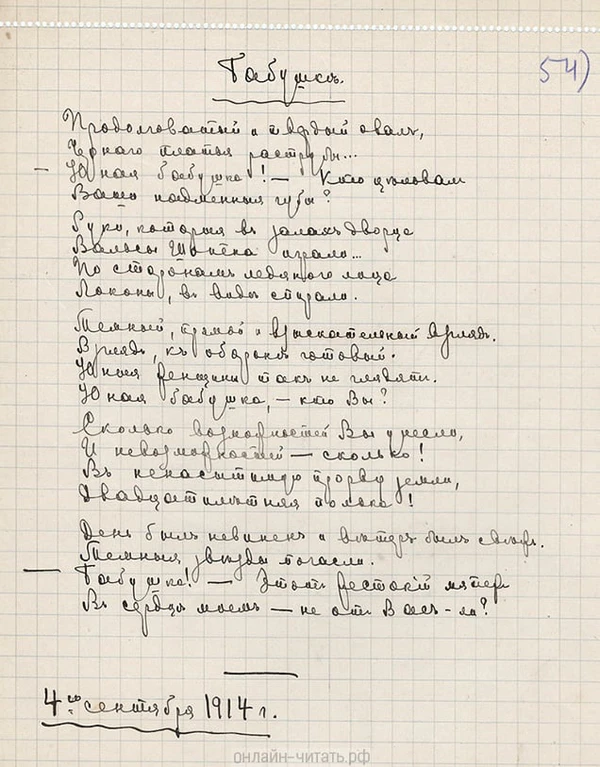 Стихотворение написано 4 сентября 1914 года[2]. Впервые опубликовано в 1961 году в книге «Избранное» (стр. 35)[3][4].