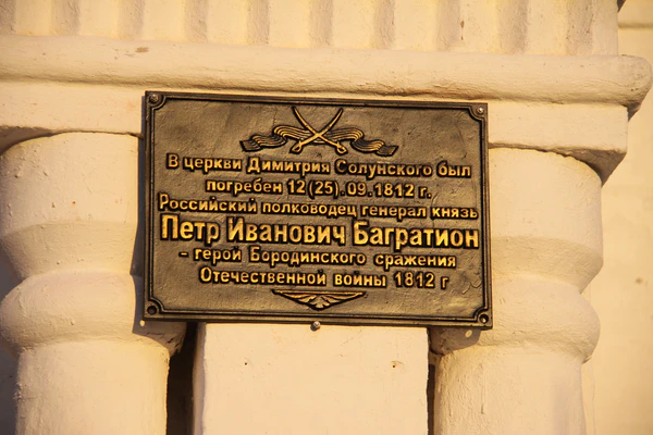 - Бюст Багратиону (Владимирская область), установлен в 2012 году, в селе Сима Юрьев-Польского района, на месте первоначального упокоения полководца[30]. Также установлена табличка на храме св. Димитрия Солунского — месте захоронения П. Багратиона. А на главном доме усадьбы Голицина установлена табличка о месте смерти П. Багратиона.