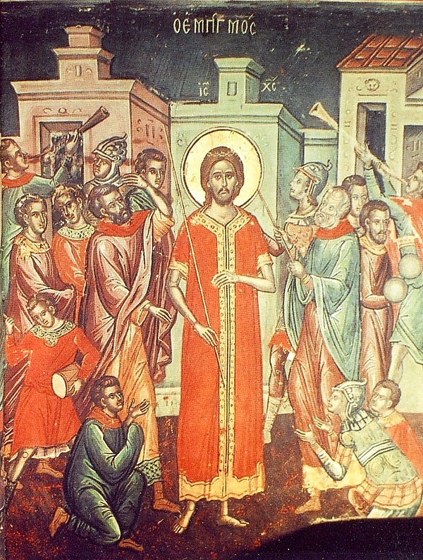 Поскольку ношение пурпурной багряницы в то время считалось привилегией лишь императора Рима, римские солдаты надевали на Иисуса солдатский плащ и терновый венец (вместо царского венца) в качестве «карикатуры», для того, чтобы поиздеваться над Ним.