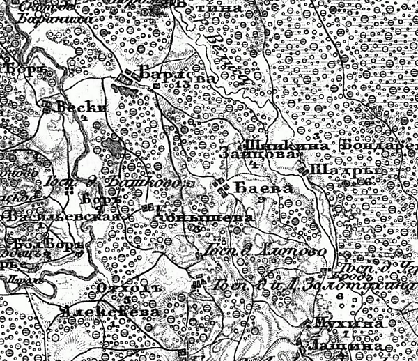 На топографической карте Фёдора Шуберта 1867—1901 годов обозначена деревня Баева. Имела 9 дворов[2].
