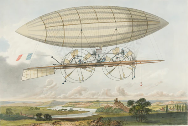 По возвращении в Анже он 7 июля 1851 года оформил свой первый патент на дирижабль[4][Комм 2], который он испытал в Маране и усовершенствовал к 1853 году, придумав устройство для регулировки силы воздушного потока[5][6][Комм 3].